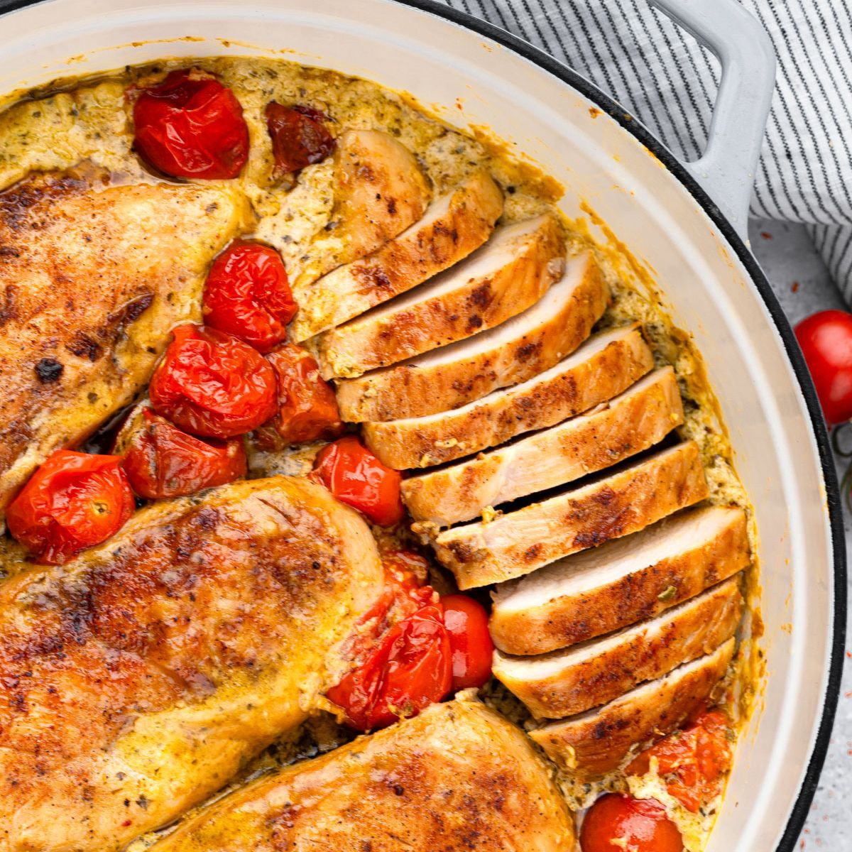 - Chicken - Pesto - Roasted tomatoes - Garlic - Parmesan - Herbs - Creamy sauce base - Salt and pepper